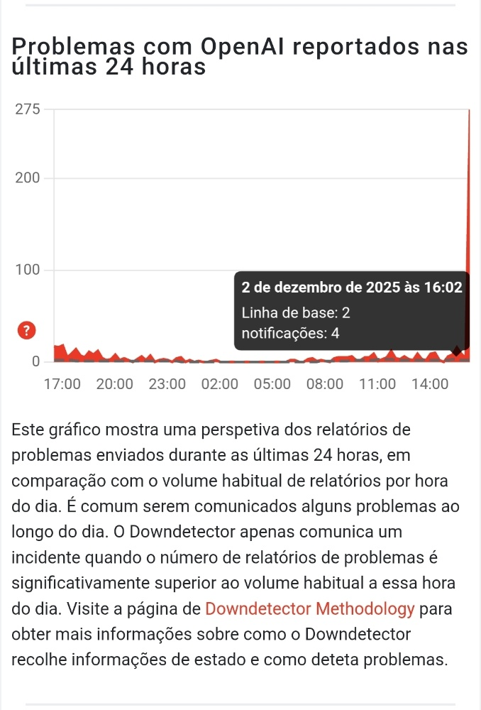 Na tarde desta terça-feira, 2 de dezembro de 2025, a inteligência artificial mais utilizada globalmente, o ChatGPT, operado pela OpenAI, sofreu uma instabilidade severa. O serviço se tornou inacessível para uma grande base de usuários, culminando em um pico de relatos de falhas por volta das 16:02 (horário de Brasília).